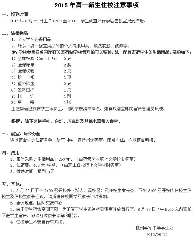《杭州超限教育中心瑪青2015年8月21日訊》近日,杭州學(xué)軍中學(xué)發(fā)布了2015年新高一學(xué)生報(bào)到時(shí)間及相關(guān)學(xué)員的住宿名單。