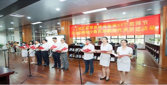 《杭州超限教育中心王林2015年9月8日訊》舉國歡慶中國人民抗日戰(zhàn)爭暨世界反法西斯戰(zhàn)爭勝利勝利70周年的振奮人心的節(jié)日氣氛還未散盡。9月7日下午,上城區(qū)全體民主黨派和少數(shù)民資教師在新落成的北師大附屬杭州中學(xué),再次為幸福包圍。區(qū)教育系統(tǒng)慶祝第31個(gè)教師節(jié),民主黨派和少數(shù)民族教師代表聯(lián)誼活動(dòng)在這里隆重舉行。上城區(qū)區(qū)委統(tǒng)戰(zhàn)部副部長毛健兒,上城區(qū)教育局副局長朱惠強(qiáng)與全區(qū)眾多民主黨派與少數(shù)民族教師代表濟(jì)濟(jì)一堂共慶教師節(jié)。此次活動(dòng)旨在慰問長期以來為上城教育作出突出貢獻(xiàn)的民主黨派教師與少數(shù)民族教師,同時(shí)進(jìn)一步充分發(fā)揮其上通下達(dá)、言路暢通、聯(lián)系面廣的優(yōu)勢,為促進(jìn)上城教育事業(yè)的機(jī)制創(chuàng)新和持續(xù)進(jìn)步,實(shí)現(xiàn)上城教育的高質(zhì)量發(fā)展貢獻(xiàn)新的力量。